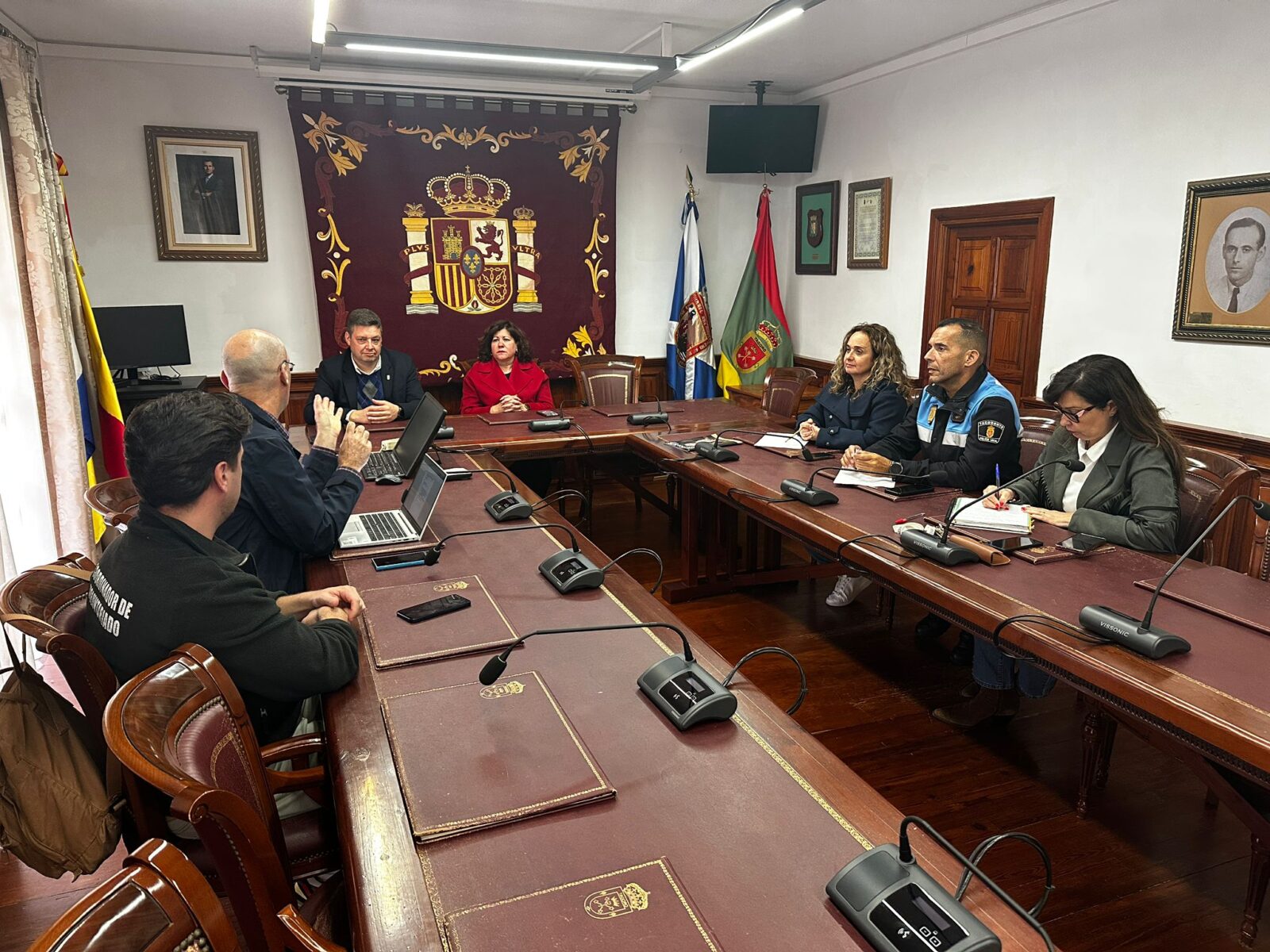 La alcaldesa Sandra Izquierdo; la primera teniente de alcalde y responsable de Tráfico, Movilidad, Transporte y Protección Civil, Noemí García; la concejala de Seguridad Ciudadana y Policía Local, Vanessa Luis-Ravelo; y el oficial jefe accidental de la Policía Local, Alexis Castro, se reunieron este martes con el director insular de Seguridad y Emergencias, Iván Martín, para valorar las novedades del nuevo proyecto de Protección Civil para todos los municipios de la Isla en materia de emergencias.