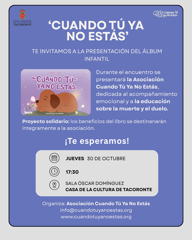 La sala Óscar Domínguez de la Casa de la Cultura de Tacoronte será el escenario que acoja este jueves 30 de octubre, a las 17.30 horas, el acto de presentación de uno de los recursos más preciados del colectivo: el álbum infantil Cuando tú ya no estás, de Davinia García. Esta obra habla de cómo encajar la adversidad y aprender a convivir con el dolor que dejan las pérdidas y los fracasos, con personajes que invitan a reflexionar desde la serenidad y la calma, con líneas dedicadas al acompañamiento, formación e información de adultos y niños involucrados en procesos de duelo y/o muerte.