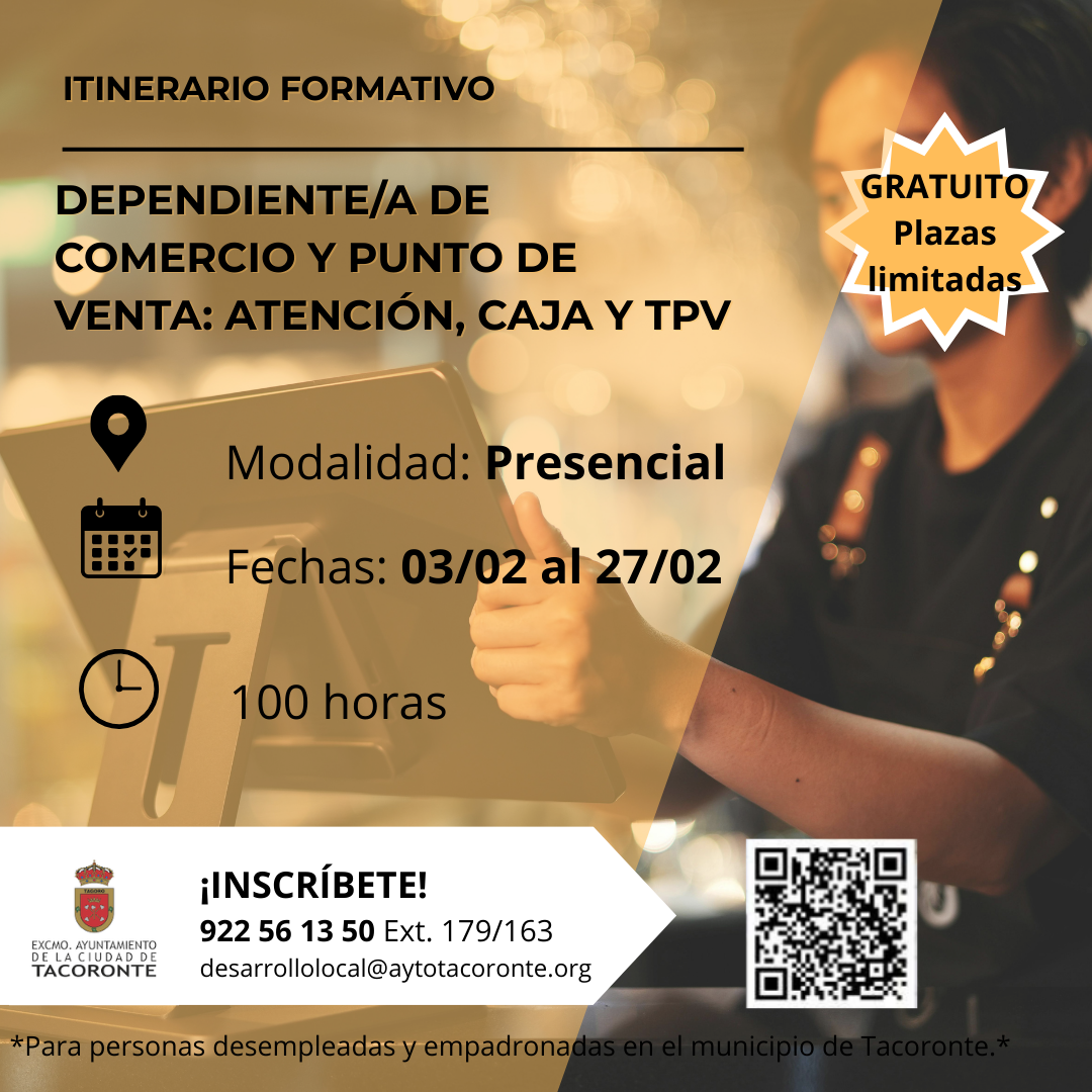 Este viernes 16 de enero se abrirá el plazo de inscripción para participar en el curso municipal «Dependiente/a de comercio y punto de venta: atención, caja y TPV», impulsado por la Agencia de Empleo y Desarrollo Local y previsto del 3 al 27 de febrero. Se trata de la primera de las acciones formativas previstas para este 2026, con una bolsa de 15 plazas dirigidas a personas desempleadas y empadronadas en Tacoronte y un programa de contenidos de 100 horas de capacitación presencial. Las clases se impartirán de lunes a viernes, de 09.00 a 14.00 horas en la Casa de la Cultura de Tacoronte, a través de un ambicioso programa estructurado en siete bloques: atención al cliente y técnicas de venta, operaciones en el punto de venta, gestión de cobros y caja, normativa, calidad y prevención de riesgos, competencias digitales para el comercio, inteligencia artificial aplicada al comercio e inserción laboral y orientación profesional. El periodo de reserva de plazas permanecerá activo hasta el 30 de enero, a través del portal https://tacoronte.desarrollolocal.es/ También podrá utilizarse la comunicación telefónica, llamando al 922 561350 (extensiones 179/163), o la vía digital mediante la siguiente dirección de correo electrónico: desarrollolocal@aytotacoronte.org