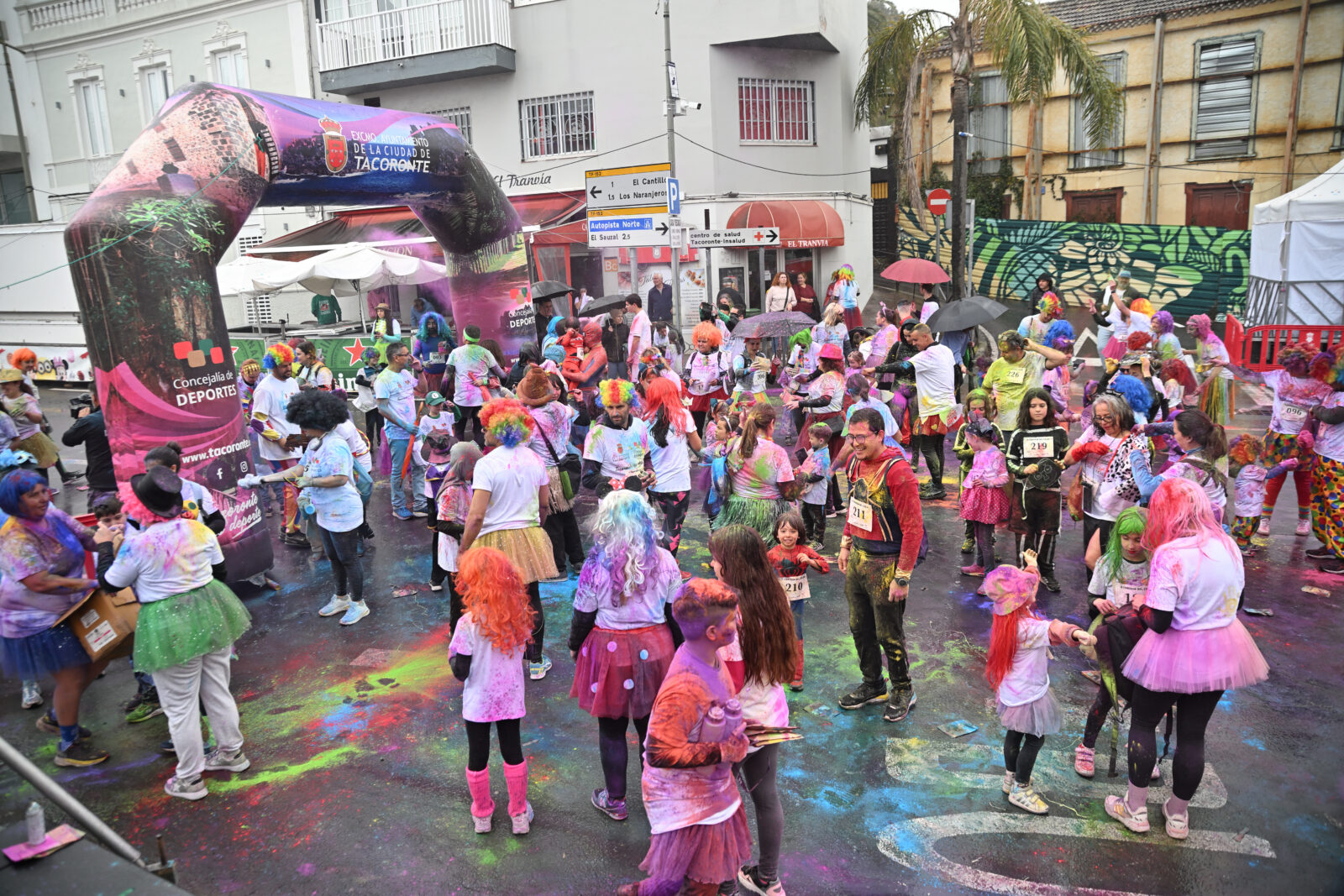 Varios cientos de personas respondieron a la llamada de la Concejalía de Deportes, con un amplio desfile de mascaritas ataviadas con pelucas, gafas y otros tantos complementos. Durante la mañana se procedió al reparto de los dorsales entre todas las familias inscritas, junto a las camisetas y los populares sobres con polvos de colores para teñir el recorrido de ida y vuelta entre Ismael Domínguez y Familia Quesada Sánchez.