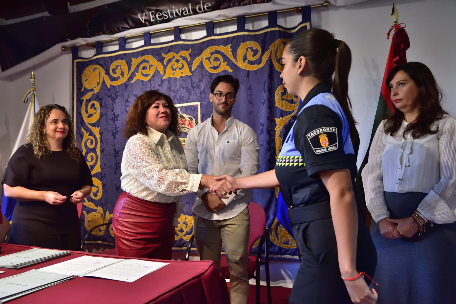 La sala Óscar Domínguez de la Casa de la Cultura de Tacoronte acogió en la mañana de hoy la ceremonia de toma de posesión de 16 nuevos agentes de la Policía Local de la ciudad. El acto contó con la presencia de la alcaldesa Sandra Izquierdo, la primera y el segundo teniente de alcalde, Noemí García y José Caro; la concejala de Seguridad Ciudadana y Policía Local, Vanessa Luis-Ravelo; el secretario municipal, Jordi García; y el oficial jefe accidental de la Policía Local, Luis Alexis Castro. Con la contratación de este nuevo grupo de profesionales el Gobierno local materializa la ampliación de la plantilla policial, que pasa de 13 a 29 efectivos, un incremento de más del doble de los efectivos actuales que hará posible mejorar y reforzar de manera significativa las labores que se vienen realizando en materia de orden público, tráfico y seguridad ciudadana, entre otras.