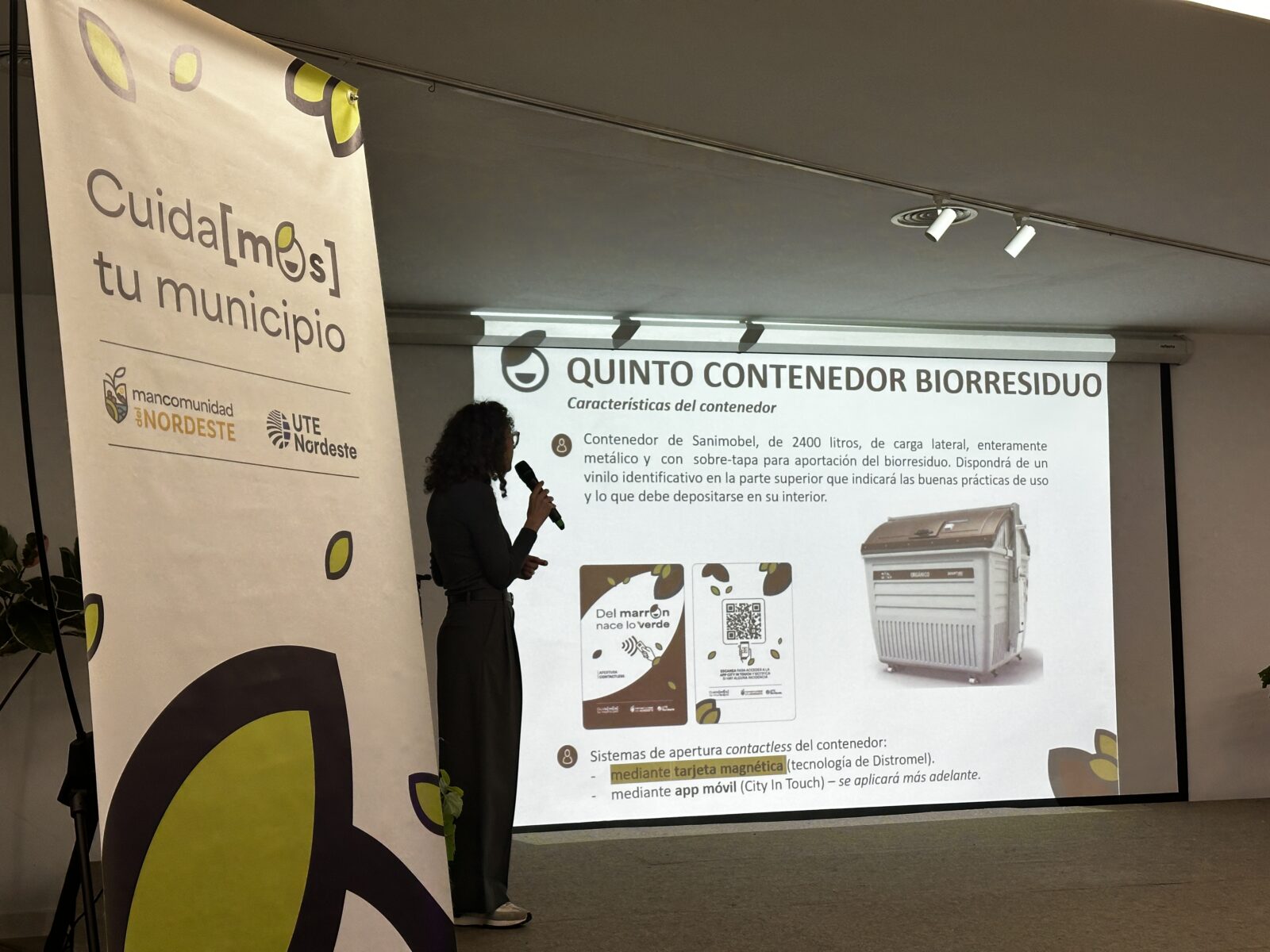 La Mancomunidad del Nordeste de Tenerife presentó este viernes en el espacio interior de la plaza de La Estación de Tacoronte el nuevo servicio de recogida de materia orgánica que entrará en funcionamiento a lo largo de las próximas semanas a través del conocido «quinto contenedor», de color marrón y con apertura controlada mediante tarjeta identificativa.