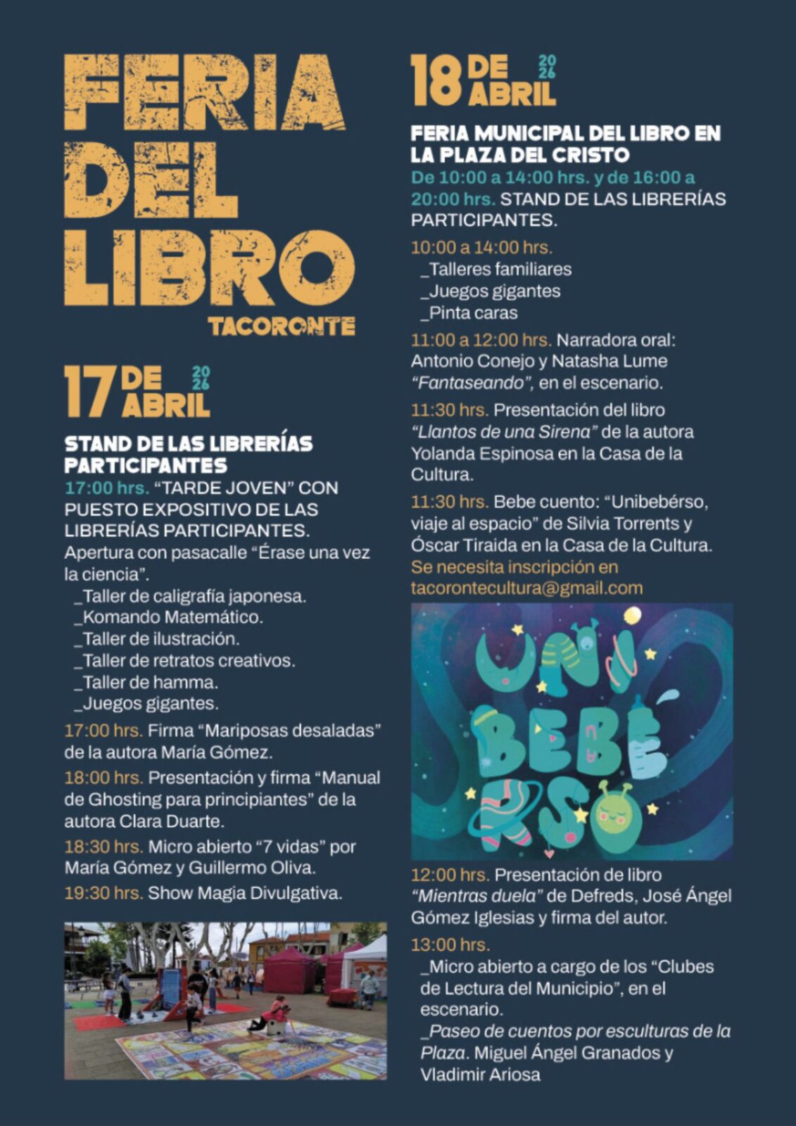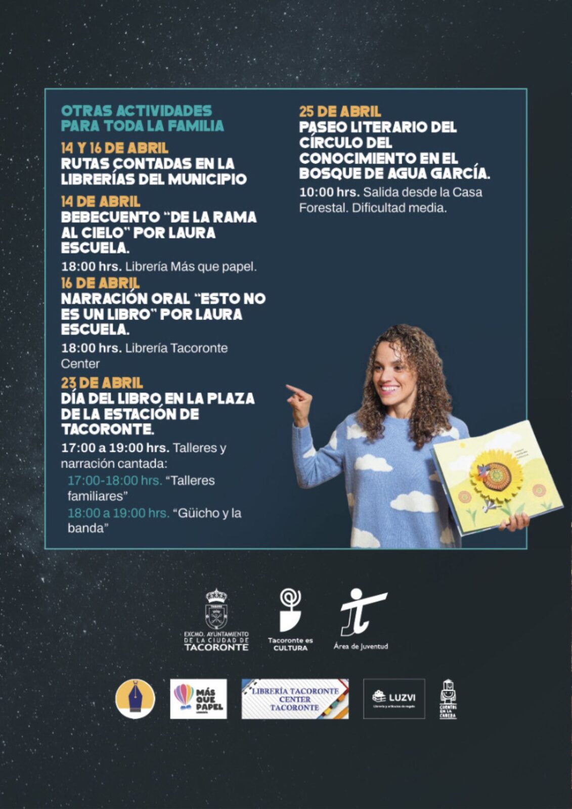 La Concejalía de Cultura, dirigida por la alcaldesa de la ciudad Sandra Izquierdo, celebrará del 17 al 19 de abril una nueva edición de la tradicional Feria del Libro de Tacoronte. El cartel de actos conmemorativos en torno al Día Internacional del Libro recoge unas cuarenta citas culturales en la Plaza del Cristo y la Casa de la Cultura, con presentaciones de libros, stands de librerías, talleres y juegos, narración oral, mesas redondas, actuaciones musicales y teatro. Además, a lo largo del mes de abril se pondrán en marcha otras iniciativas como la III Ruta de las Librerías, un paseo literario por el Bosque de Agua García, a cargo del Club de Lectura de Narrativa «Círculo del Conocimiento», o una tarde de talleres y narración cantada en la céntrica plaza de La Estación.
