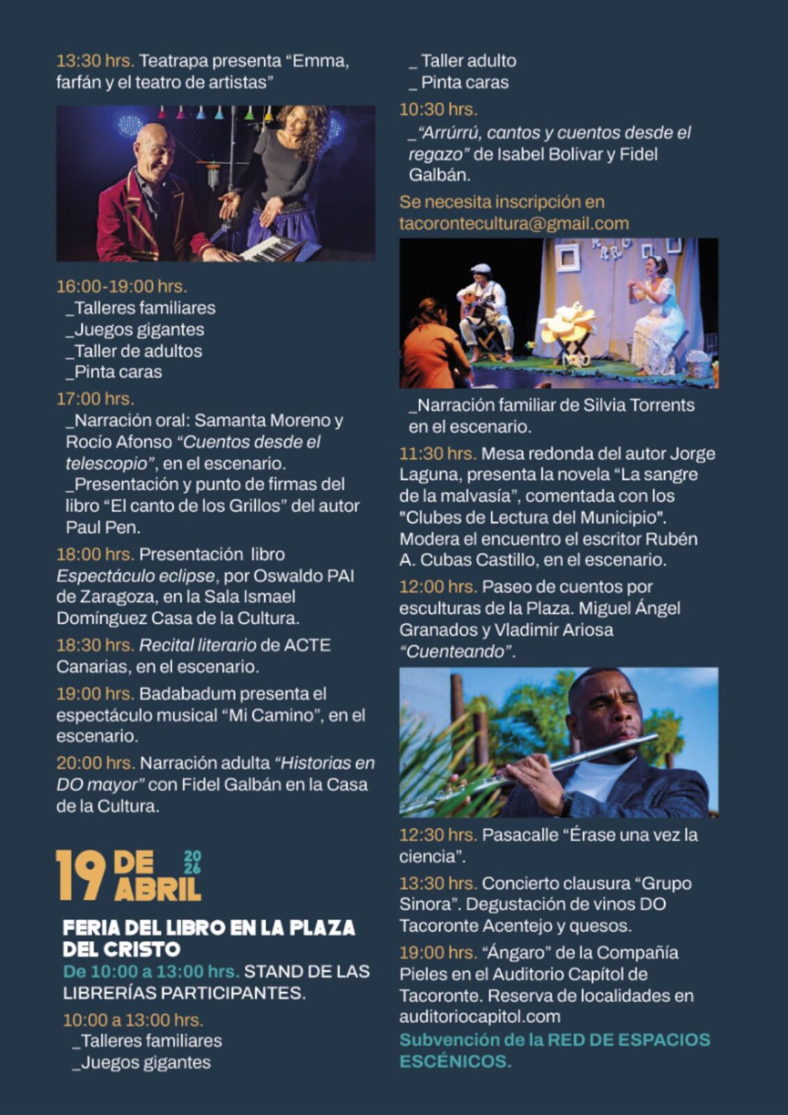 El público tendrá la oportunidad de disfrutar durante la mañana dominical de un nuevo escaparate de las librerías locales, además de talleres y juegos en familia, citas escénicas a pie de plaza, un paseo de cuentos por las esculturas del entorno peatonal y una mesa redonda del autor Jorge Laguna, con la que presentará su novela «La sangre de la malvasía», comentada por los propios clubes de lectura de Tacoronte. Bibiana Reyes también estará presente en la «Carpa de Autores» de la feria para firmar ese día su nuevo libro «Bajo el Convento». A las 13.30 horas se pondrá el broche final de la edición con un concierto a cargo del Grupo Sinora, acompañado de una degustación de vinos de la DO Tacoronte Acentejo y quesos. Para el domingo 19 de abril, a las 19.00 horas, también está prevista la obra «Ángaro», de Laboratorio Escénico en el Auditorio Municipal Capitol.