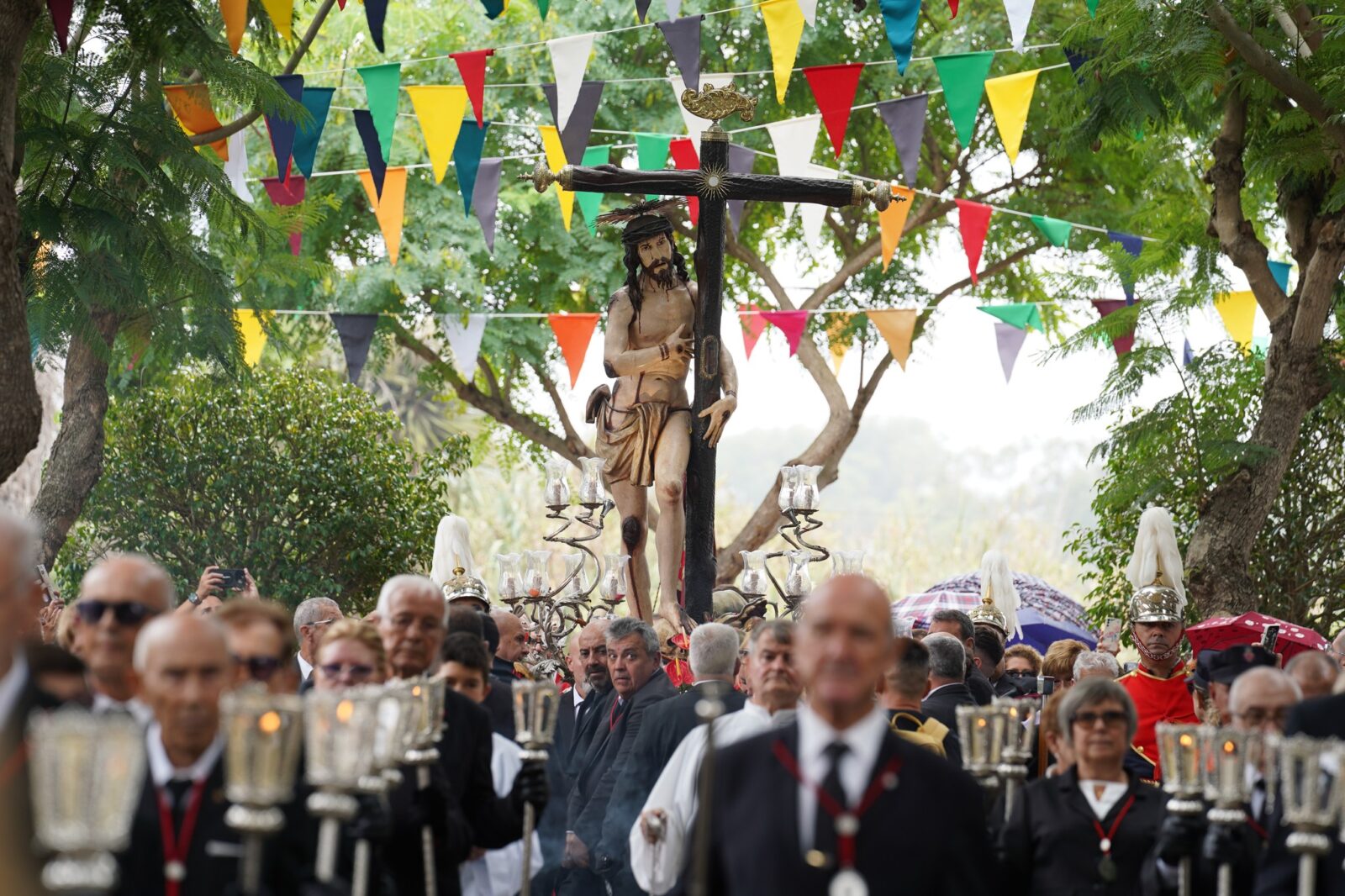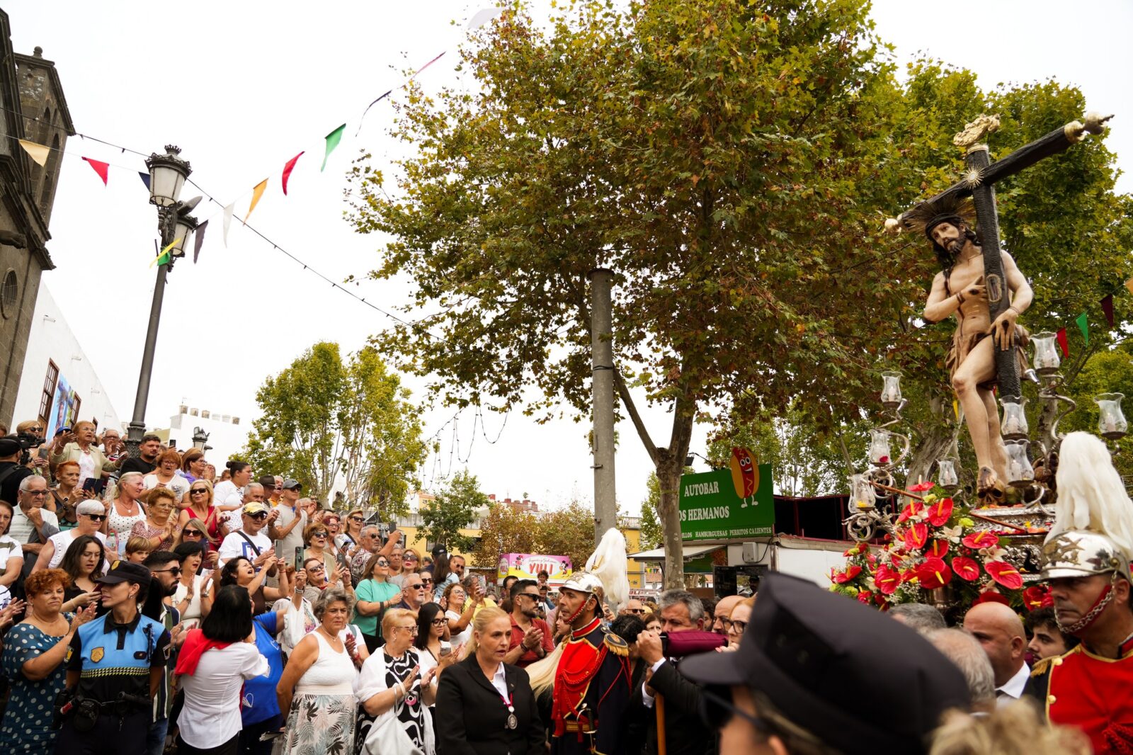 La programación dominical se puso en marcha con la apertura del templo a las 6 de la mañana para recibir a los primeros peregrinos del día, procedentes principalmente de los municipios sureños de Güímar, Arafo y Candelaria. La inauguración de la trigésimo novena Feria de Artesanía en el entorno del Ayuntamiento, con más de 60 stands y un centenar de profesionales de todas las Islas, dio paso a los actos principales de la jornada, con el traslado del Pendón Municipal desde las Casas Consistoriales al Santuario del Cristo, a cargo de la concejala Yaiza Díaz, el pregonero José Ángel Almenar y su hijo, Marcos Almenar. Esta comitiva previa a la función religiosa del mediodía estuvo presidida por la alcaldesa de la ciudad, Sandra Izquierdo, y los tenientes de alcalde, Noemí García y José Caro, acompañados por una amplia lista de cargos públicos y autoridades militares, como el diputado nacional, Juan Antonio Rojas; el vicepresidente primero del Cabildo de Tenerife, Lope Afonso; la parlamentaria regional, Nira Fierro; la alcaldesa de Candelaria, Mari Brito; el alcalde de El Sauzal, Mariano Pérez; la regidora güimarera, Carmen Luisa Castro; y el primer edil de Arafo, Juan Ramón Martín.