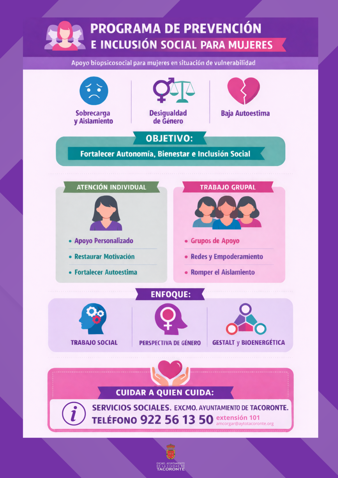 El Ayuntamiento de Tacoronte, a través de la Concejalía de Servicios Sociales, dirigida por José Caro, anuncia la puesta en marcha de un nuevo programa de prevención e inclusión social para acompañar a mujeres residentes en la ciudad que se encuentren en situación de vulnerabilidad o en riesgo de estarlo. La iniciativa surge como servicio complementario a la labor que vienen desarrollando las Unidades de Trabajo Social del departamento, con el objetivo de ayudar a restaurar la motivación de las participantes, impulsando para ello la construcción de un proyecto de vida más autónomo y digno.