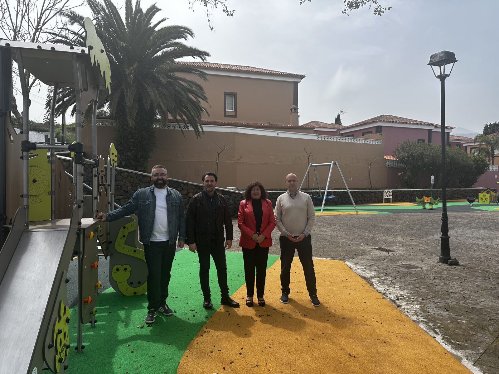 La alcaldesa de la ciudad, Sandra Izquierdo; el segundo teniente de alcalde y responsable de Obras y Servicios Municipales, José Caro; y los concejales de Contratación y Parques y Jardines, Eduardo Dávila e Iván Hernández respectivamente, visitaron recientemente la plaza del Adelantado para comprobar el resultado de la inversión realizada en la zona a lo largo del último año, una apuesta del Gobierno local con la que se ha logrado renovar todo el espacio de ocio infantil, convirtiéndolo en el primer parque inclusivo de Tacoronte. Este equipamiento, dividido en dos espacios diferenciados de la plaza, cuenta ahora con varios juegos combinados de aventura, paneles informativos, un columpio adaptado y pavimento de caucho homologado.