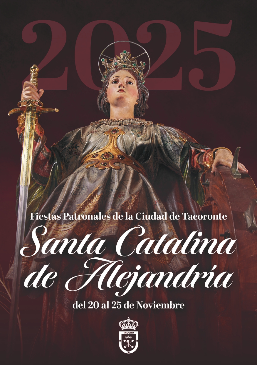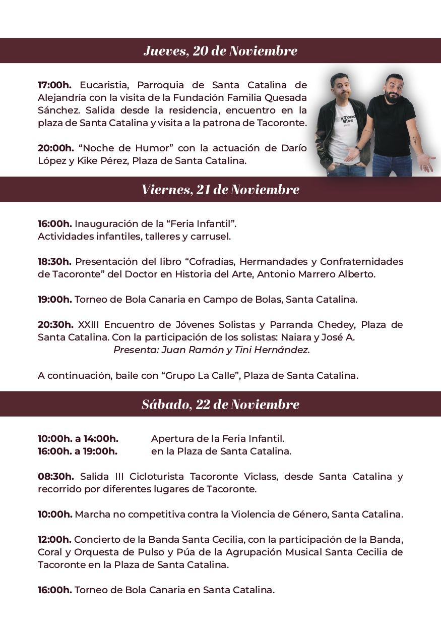 Las fiestas patronales de la Ciudad de Tacoronte 2025 se desarrollarán del 20 al 25 de noviembre, con escenario principal en la Parroquia y entorno peatonal de Santa Catalina. El programa de esta edición recoge para la tarde de este jueves 20 un encuentro de residentes de la Casa de Acogida Familia Quesada Sánchez y, a partir de las 20.00 horas, la «Noche de Humor», con las actuaciones de Darío López y Kike Pérez. Con la inauguración de la Feria Infantil de las fiestas se pondrá en marcha el conjunto de actos diseñado para este viernes 21, en el que se incluye la presentación del libro «Cofradías, Hermandades y Confraternidades de Tacoronte», del doctor en Historia del Arte, Antonio Marrero; el Torneo de Bola Canaria 2025 y el XXIII Encuentro de Jóvenes Solistas y Parranda Chedey, con baile final a cargo del Grupo La Calle.