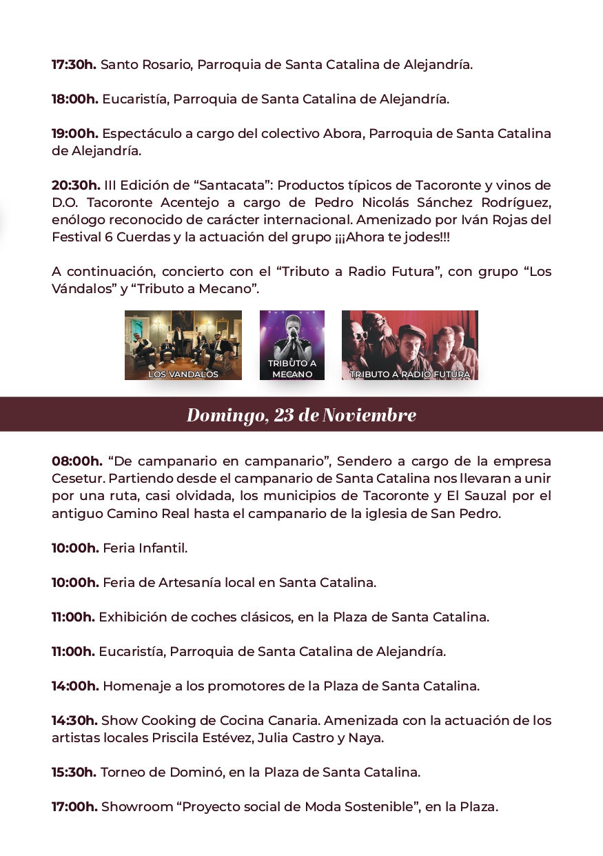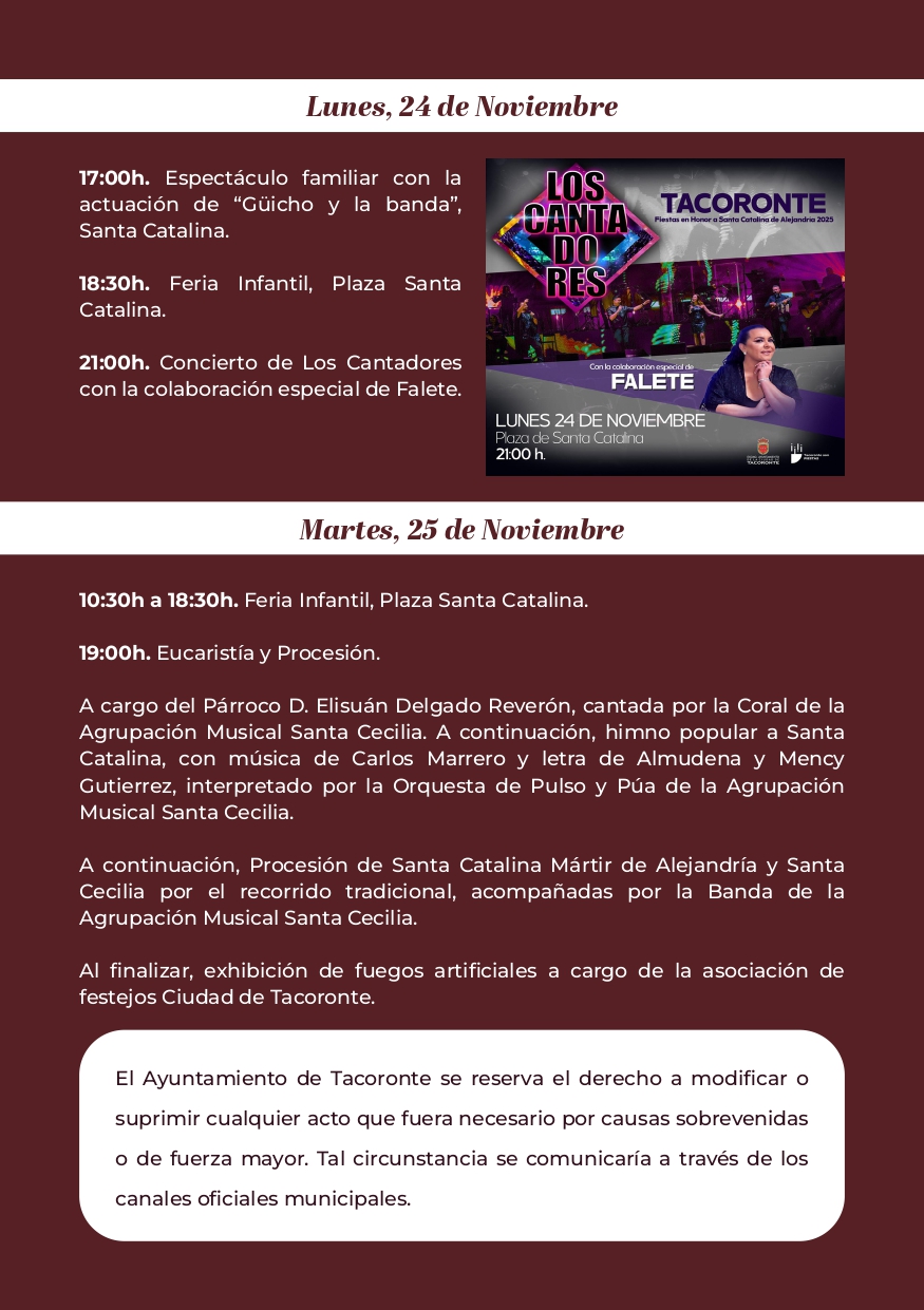 El Ayuntamiento de Tacoronte, a través de las concejalías de Cultura y Fiestas, anuncia para el lunes 24 de noviembre la celebración del espectáculo familiar «Güícho y la banda», además de una nueva tarde de feria infantil y el concierto final a cargo de los Cantadores, con la colaboración especial de Falete. El día grande de la patrona de la ciudad se vivirá el martes 25, festivo local y efeméride de Santa Catalina Mártir de Alejandría. Por la mañana se mantendrá abierta la feria infantil de la edición para todas las familias que deseen disfrutar del conjunto de atracciones y actividades previstas en esta apuesta de dinamización pensada para los más pequeños y pequeñas de casa. La función religiosa en honor a la patrona de Tacoronte dará comienzo a las 19.00 horas, cantada por la Coral de la A.M. Santa Cecilia y con himno popular en directo a través de la música de Carlos Marrero, letra de Almudena y Mency Gutiérrez e interpretación de la Orquesta de Pulso y Púa de la A.M. Santa Cecilia. La eucaristía finalizará con la tradicional procesión de la venerada imagen por el recorrido de costumbre, acompañada por la Banda de Música de la ciudad. La edición concluirá con una exhibición de fuegos artificiales a cargo de la Asociación de Festejos Ciudad de Tacoronte.