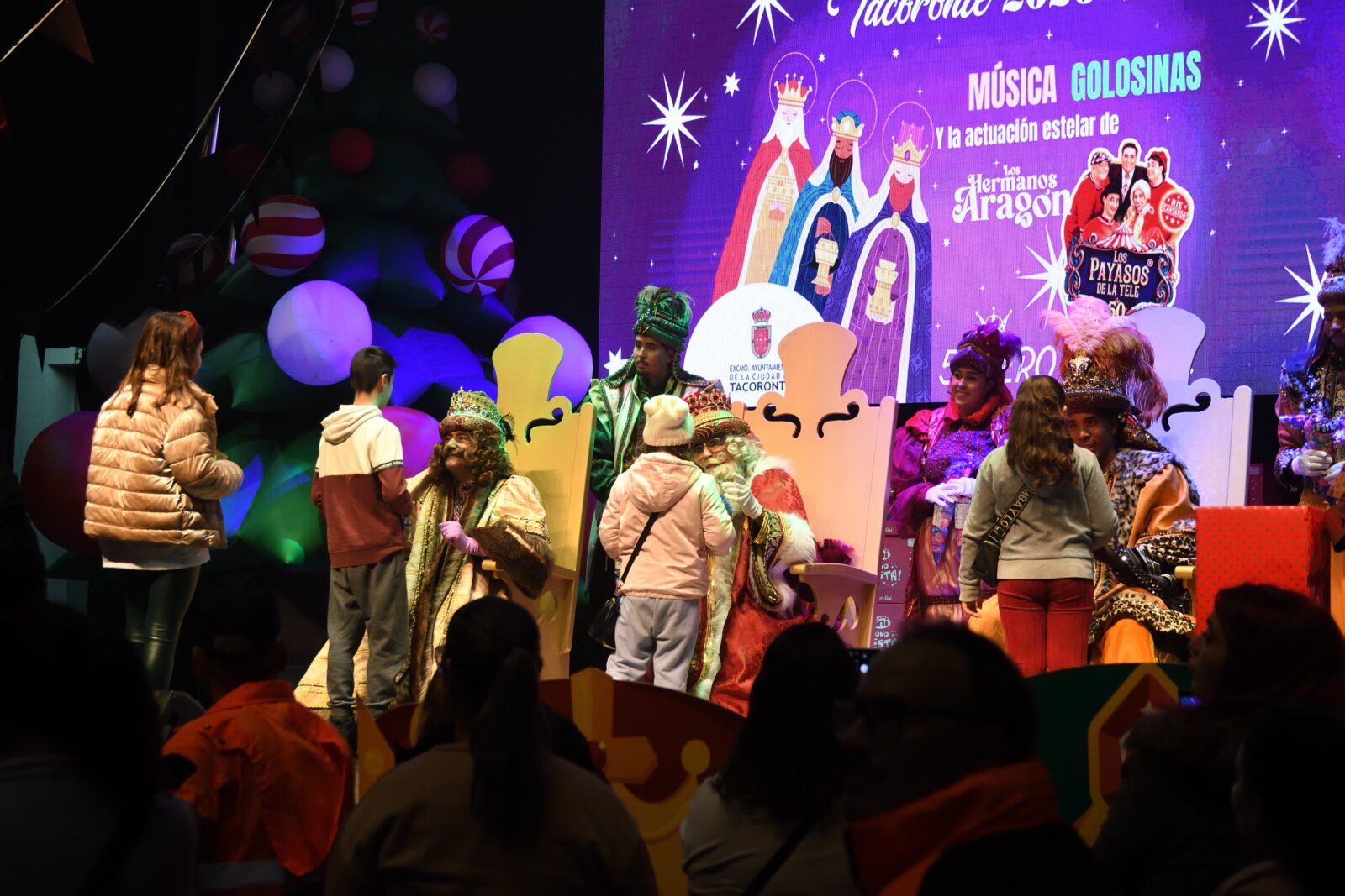 Por la mañana se desarrolló con éxito la gran recepción de los Reyes Magos, con cerca de medio millar de personas y la actuación estelar de Los Hermanos Aragón, descendientes directos de los legendarios payasos de la tele: Gaby, Fofó y Miliki. En esta primera toma de contacto la alcaldesa Sandra Izquierdo; la primera teniente de alcalde y concejala de Fiestas, Noemí García; y el segundo teniente de alcalde, José Caro, se encargaron de dar la bienvenida a nuestros mágicos invitados, subrayando la importancia de la visita y la elección de Tacoronte para realizar una rápida pausa en su ajetreada agenda.